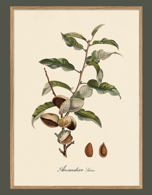 Ametller. Il·lustració decorativa emmarcada en fusta de roure.