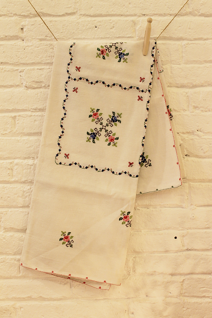 Linen cloth of cooking with red initials (“FH”) embroidered on one side.