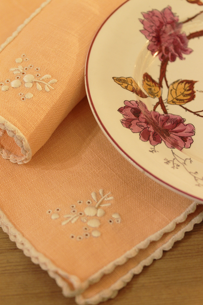 Pink light coloured napkins embroidered at the ends and with a detail in a corner. Along with the hand painted dish (La Cartuja) flower, they remind us of the chocolate snacks.